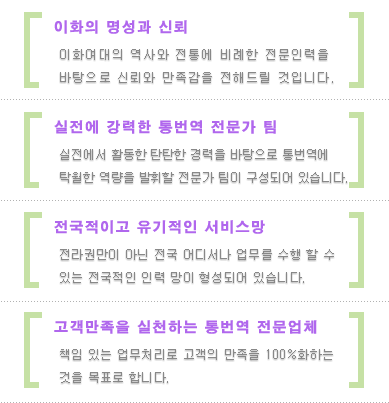 Welcome to Ewha office of translation and interpretation. Thank you for visiting us today. We would like to assist your business in the area of translation and English education in Gwangju, Jellanamdo. If needed, do not hesitate to contact us at diplomatinkj@hanmail.net We look forward to working with you soon. |